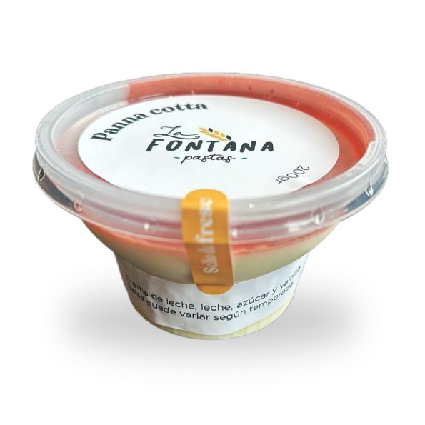 Panna Cotta hecha en casa, 200 gramos aproximados. Salsa de frutilla, frambuesa u otro fruto rojo, este variará según temporada.